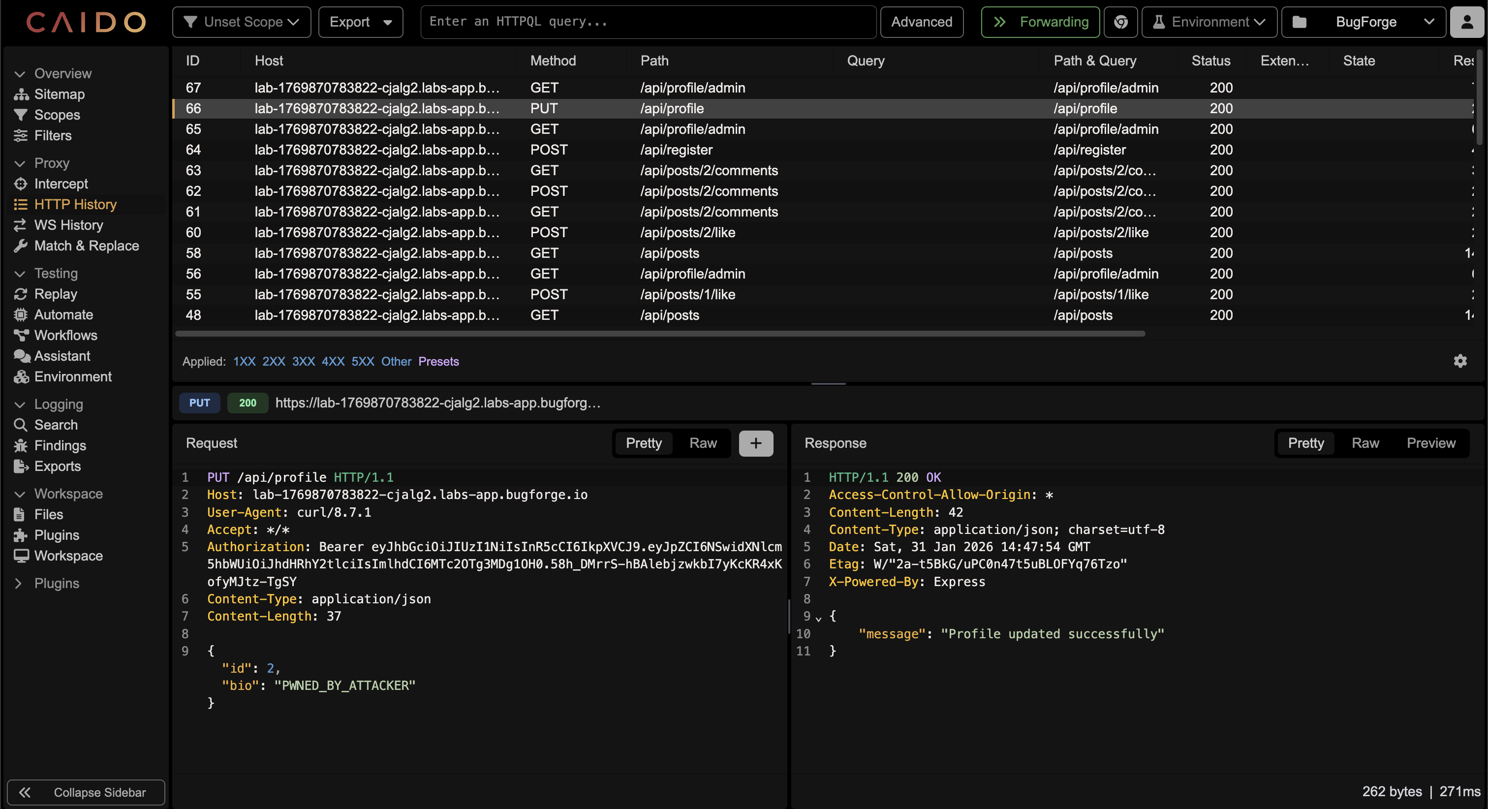 ⏺ caido - caido_send_request (MCP)(raw: "PUT /api/profile/tester HTTP/1.1\nHost: lab-1769869490510-qc54ar.labs-app.bugforge.io\nAuthorization: Bearer