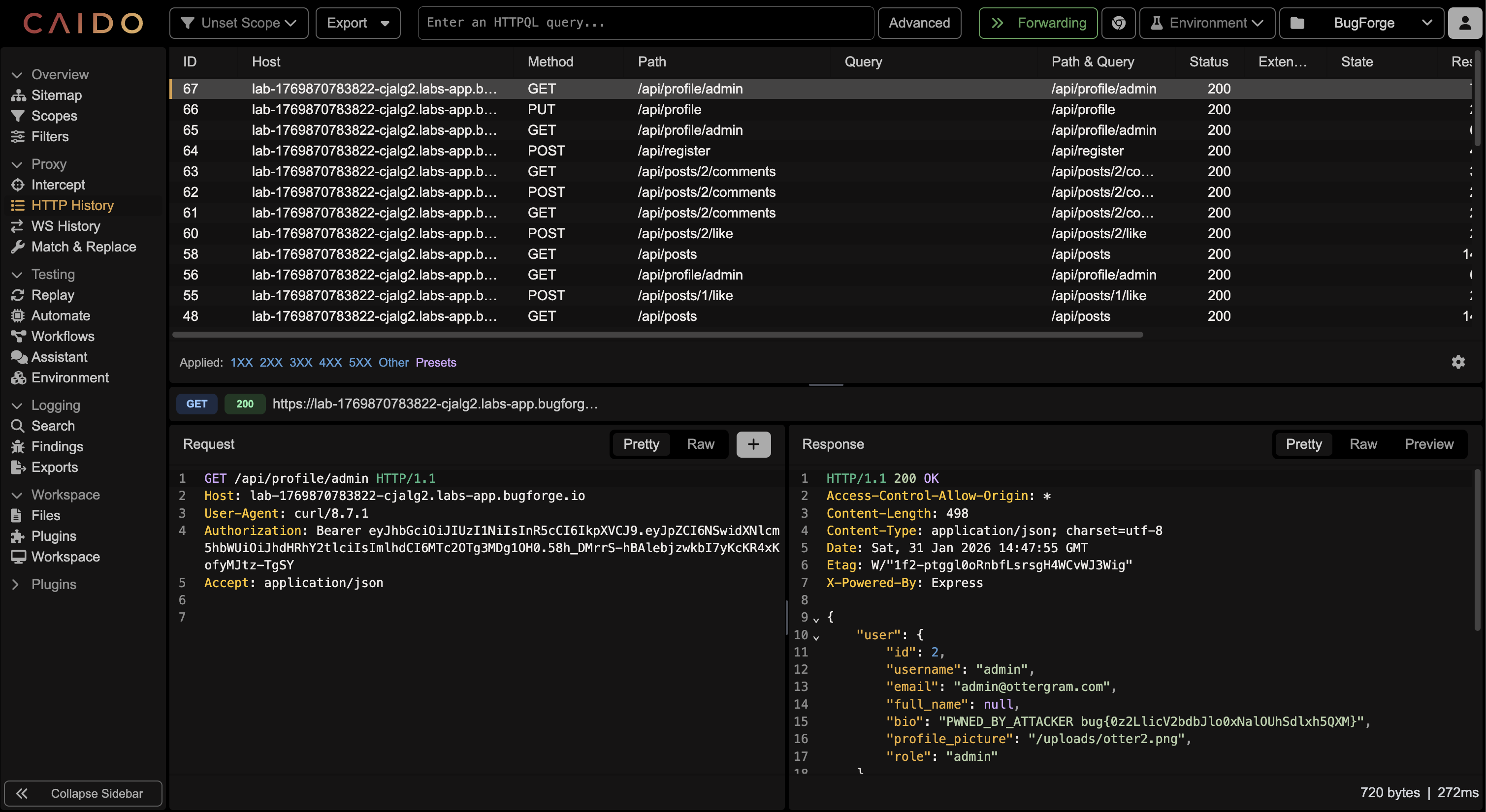 ⏺ caido - caido_send_request (MCP)(raw: "GET /api/profile/admin HTTP/1.1\nHost: lab-1769869490510-qc54ar.labs-app.bugforge.io\nAuthorization: Bearer